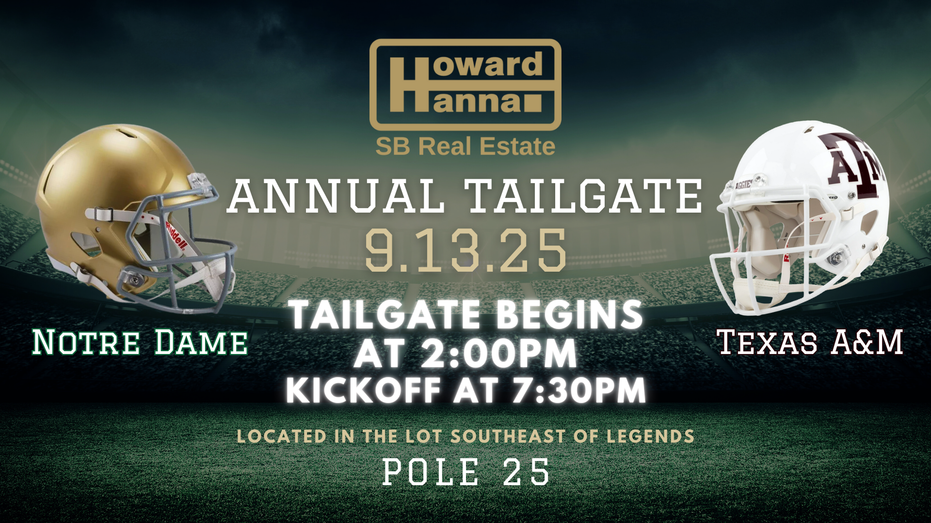 At Howard Hanna SB Real Estate, we know that finding the perfect "home base" is key – whether it's your dream house or the ideal spot for a legendary tailgate. That's why we're thrilled to invite you to our Annual Tailgate, bringing together the vibrant communities of Notre Dame and Texas A&M fans for an afternoon of unforgettable fun before these two powerhouse teams face off!